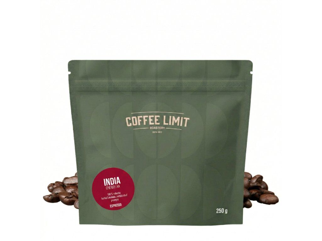 COFFEE LIMIT India Cherry AA zrna kave 250 g je prepoznatljiva kava iz Južne Indije, poznata po punom okusu, zemljanim tonovima i suptilnoj gorčini. Ova Arabica ističe se intenzivnom aromom s daškom začina i kakaa, koja će oduševiti ljubitelje jačih kava s bogatim tijelom.